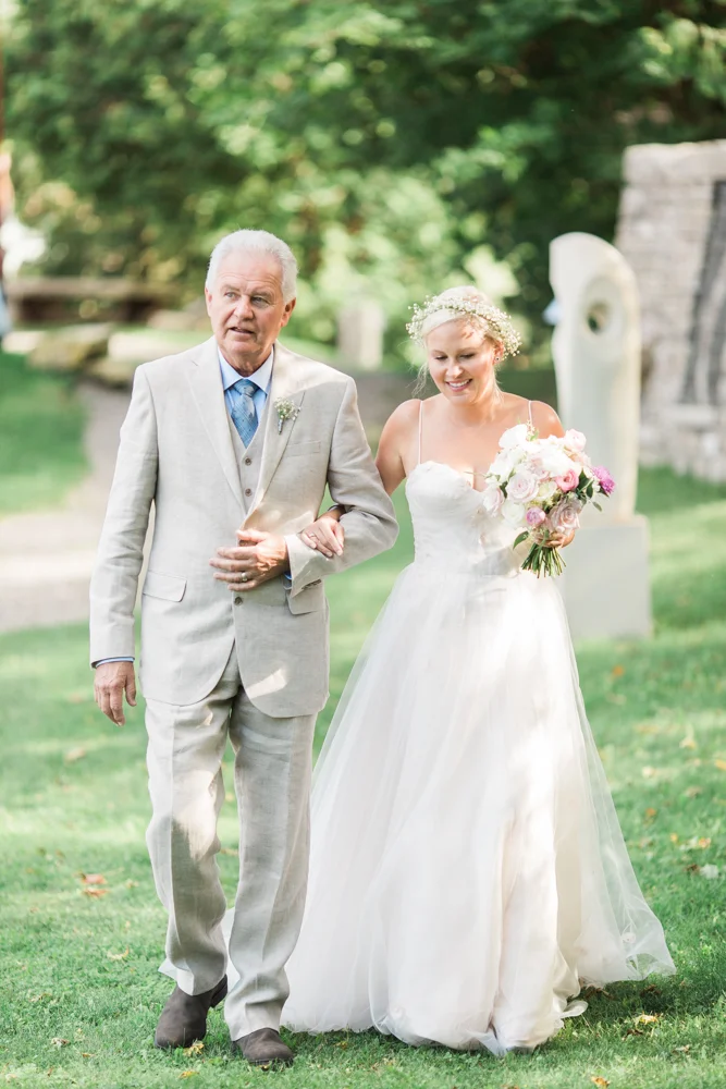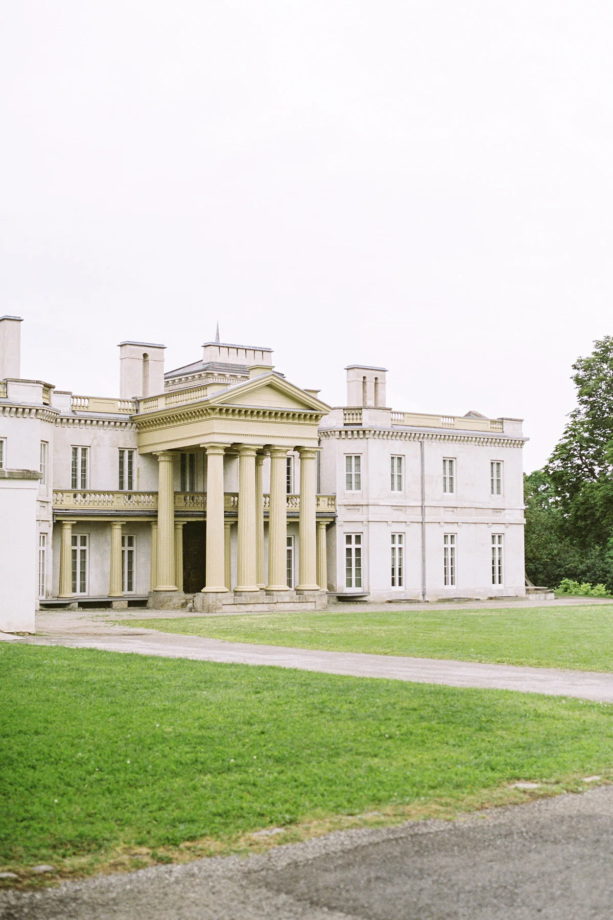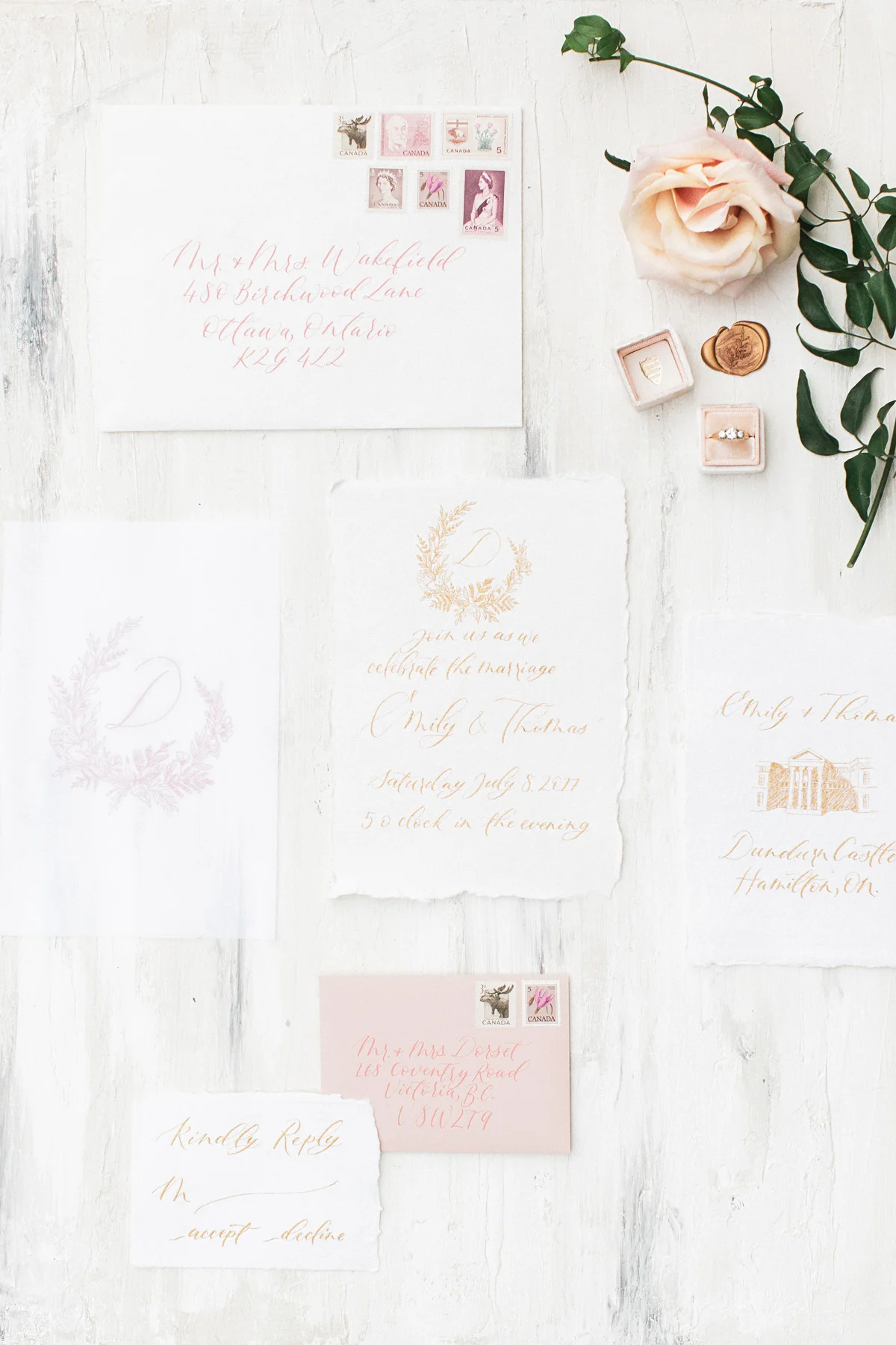 Canadian couples take note: you don't need to fly across the ocean to find the European setting of your dreams! Located in Hamilton, Ontario, Dundurn Castle is a little piece of the English countryside - tucked in a busy downtown core. It is the perfect spot for dreamy photos in the heart of the city and provided a beautiful backdrop for our English countryside editorial. Our talented team of local vendors was inspired by the colours, textures and scents of summer in the country. We were struck by the beauty of sweet cherries on the trees and the warm, caramel glow of sunsets in lush meadows. Imagining a beautiful bride running through a field in the English countryside set our hearts a flutter and we knew we had to capture that magic and share it with stylish brides and grooms-to-be. With this inspiration in mind, we chose a palette of peach, caramel and blush, which were a perfect warm contrast to the stone architecture of the castle. This mix of classic softness and modern, cool elements were carried throughout the editorial and gave it a beautiful depth. The sweetheart table, set in a tree-lined gravel lane, had a perfect view of the castle and the lush grounds beyond. We chose ivory linen with a soft blush runner and accented it with charcoal grey chargers, modern silver flatware and beautiful etched goblets. The stunning florals, golden miniature cakes and fresh local fruit added just the right warmth and texture to the tablescape. The paper goods coordinated perfectly in soft blush and metallic gold with sweet vintage stamps. Naturally, our blushing bride looked absolutely radiant in an off-the-shoulder gown and ethereal jewels as she explored the grounds. Our team loved being transported to summertime in the English countryside! We hope our editorial inspires stylish Dear Gray Magazine readers to share a bit of this feeling with their guests.